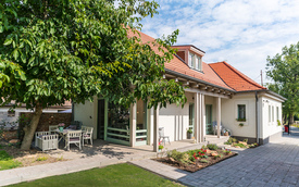 – A 2016-os bővítés is szervesen folytatja ezt a hagyományt, ugyanis téglapillérek között vályogtégla az új falazat – magyarázza Csóka Balázs, aki az átalakítást tervezte. – A falak szigetelése kőzetgyapottal készült, a belső vakolat szintén vályog, így páraáteresztő képességük nem csorbult, a szerkezet lélegző maradt. A vályog előnye, hogy egészséges belső klímát hoz létre, jótékony hatással van a légúti problémákkal, allergiával küszködőkre. Energetikai szempontból pedig jó a hőmegtartó képessége.